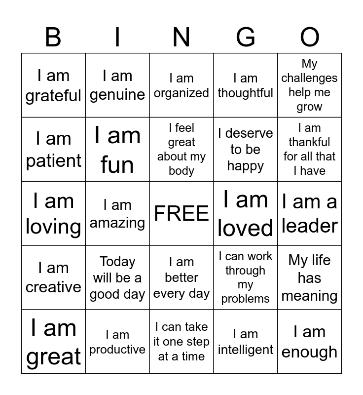 This bingo card has a free space and 118 words: I am positive, I am funny, I have limitless potential, I will make good choices, I am talented, I show empathy, I am thoughtful, I am caring, I am nice, I am helpful, I am valuable, I respect myself, I am motivated, I will succeed, I am capable, I am blessed, I am better every day, I am mindful, I am wise, I am healthy, I am great, I am organized, I am beautiful, I am courageous, I have positive and healthy relationship, I am creative, I am productive, I do my best every day, I am happy, I am free of worry or regret, I am thankful for all that I have, I feel great about my body, I am amazing, I am extraordinary, I am inventive, I am generous, I am passionate, I am fortunate, I am unique, I am bright, I am trustworthy, I am brilliant, I am fabulous, I am compassionate, I am respectful, I am willing, I am intelligent, I am patient, I am deserving, I am friendly, I am peaceful, I am loved, I help others, I ask for help, I am good enough, My life is important, I am worthy, I try my best, I am brave, My existence matters, My life has meaning, I learn from mistakes, I am awesome, I am growing, I am not a failure, I refuse to quit, I am forgiving, I am fun, I am loving, I am honest, I am a leader, I am strong, I am supportive, I am a good listener, I am a hard worker, I am genuine, I am enough, Today will be a good day, I am grateful, I am confident, I am powerful, I am proud of myself, I get better every day, I am an amazing person, I can work through my problems, It's OK to make mistakes, I deserve to be happy, I can make a difference, I matter, Good things are going to come to me, Today, I will work through my challenges, I have everything I need right now, Everything will be OK, I believe in myself, I can do hard things, My challenges help me grow, I will get through this, I can do better next time, I am doing my best, I am worthy of love, I love myself, I am a good person, I am free to make my own choices, I am in charge of my life, I believe in my abilities, I only compare myself to myself, I accept who I am, I can achieve my goals, My voice matters, I am calm and relaxed, I can take it one step at a time, I am thankful for today, I'm going to push through, I deserve all good things, Anything is possible, I can do it, I am successful and I am kind.