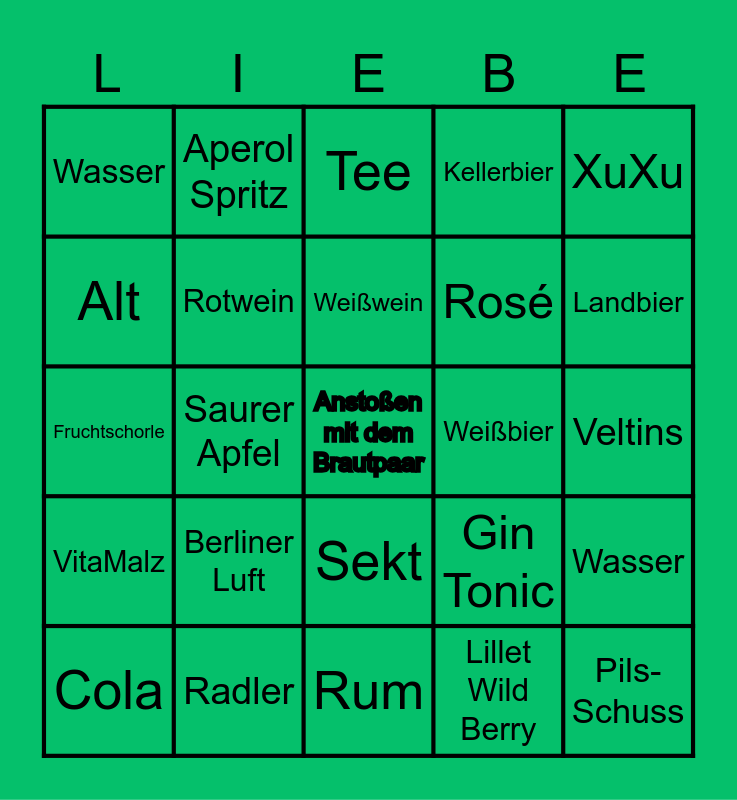 This bingo card has a free space and 24 words: Berliner Luft, Radler, Weißwein, Cola, XuXu, Wasser, Alt, Aperol Spritz, Weißbier, Sekt, Rosé, Fruchtschorle, Gin Tonic, Wasser, Rotwein, Lillet Wild Berry, Veltins, Tee, Landbier, Saurer Apfel, Pils-Schuss, VitaMalz, Kellerbier and Rum.