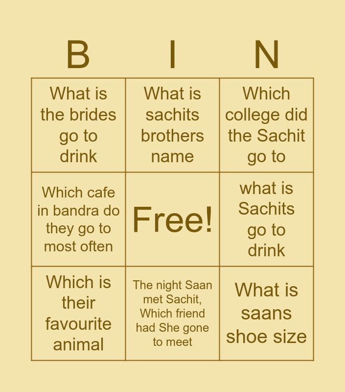 This bingo card has a free space and 24 words: When did Saan meet Sachit, Where did Saan meet Sachit, The night Saan met Sachit, Which friend had She gone to meet, On which date did Sachit propose to Saan, What is saans shoe size, What is the brides go to drink, what is Sachits go to drink, What is sachits brothers name, How long were they dating before they sealed the day, Who is the early riser, Who is the better driver, Who says sorry first, who is the bigger foodie, What did they talk about when they first met, Which is their favourite animal, Who made the first move ?, Where are they planning to go for their honeymoon, Which college did the Sachit go to, which school did the Sachit go to, what is the name of Sachits building, where is sachit going for his bachelors trip, When is Sachits birthday, Which cafe in bandra do they go to most often and Who is the bigger homebody.