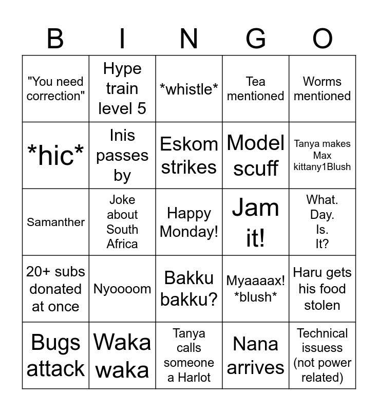This bingo card has a free space and 24 words: Nyoooom, Waka waka, Eskom strikes, Bugs attack, Worms mentioned, "You need correction", *hic*, Hype train level 5, Jam it!, Bakku bakku?, Model scuff, Samanther, Myaaaax! *blush*, Haru gets his food stolen, Inis passes by, Nana arrives, What. Day. Is. It?, *whistle*, Tanya makes Max kittany1Blush, Joke about South Africa, Technical issuess (not power related), 20+ subs donated at once, Tea mentioned and Tanya calls someone a Harlot.