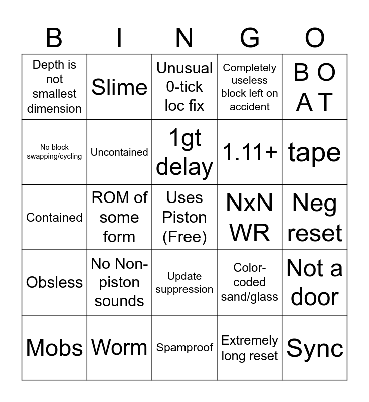 This bingo card has a free space and 33 words: 1-wide, Fully reliable (including non-dim), ROM of some form, Non-lever input, Obsless, Uncontained, B O A T, Mobs, Slime, Wall/pane/stairs, 1gt delay, Unusual 0-tick loc fix, 0 input delay, Clip into immovable, NxN WR, tape, Worm, Contained, No Non-piston sounds, Color-coded sand/glass, Update suppression, Floated entities, Depth is not smallest dimension, Neg reset, Spamproof, Sync, Completely useless block left on accident, 1.11+, No block swapping/cycling, Not a door, Unused non-valueable space on smol dur, Extremely long reset and Works in pre1.11.
