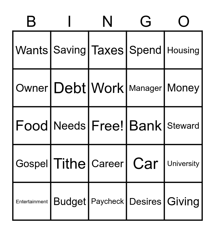 This bingo card has a free space and 25 words: Tithe, Paycheck, Work, Entertainment, Housing, Wants, Owner, Saving, Bank, Career, Manager, Food, Car, University, Debt, Finances, Steward, Taxes, Money, Needs, Giving, Budget, Gospel, Spend and Desires.