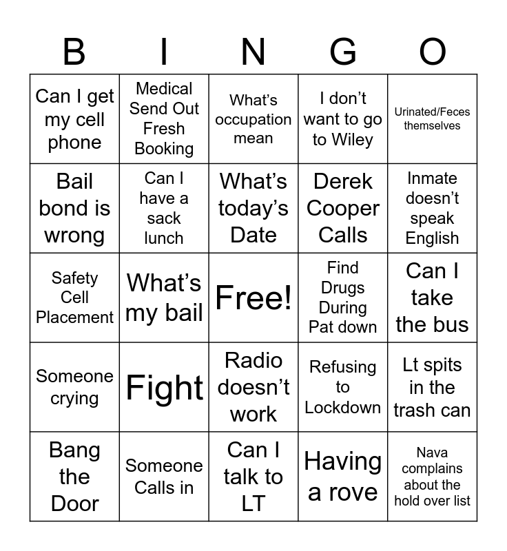 This bingo card has a free space and 33 words: My Pin Doesn’t Work, They didn’t read me my rights, What’s my bail, Call in a combative, Someone crying, Can I have a sack lunch, Urinated/Feces themselves, Bang the Door, Medical Send Out Fresh Booking, Refusing to Dress out, What’s today’s Date, What’s occupation mean, The money machine is broken, When’s my court date, Find Drugs During Pat down, Inmate doesn’t speak English, Someone Calls in, Safety Cell Placement, Fight, Refusing to Lockdown, Radio doesn’t work, Medical Transport, Can I get my cell phone, Can I take the bus, Can I talk to LT, Nava complains about the hold over list, I don’t want to go to Wiley, Derek Cooper Calls, Bail bond is wrong, Lt spits in the trash can, Not signing or asking where to sign, Having a rove and Scheduled Short.