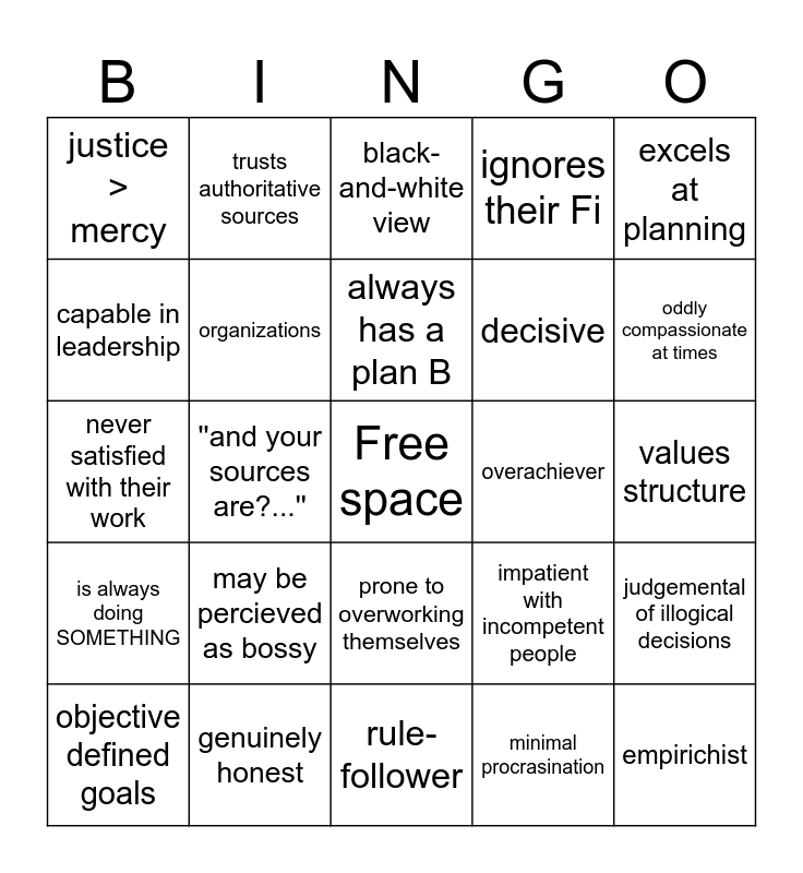 This bingo card has a free space and 24 words: may be percieved as bossy, genuinely honest, always has a plan B, objective defined goals, excels at planning, justice > mercy, capable in leadership, trusts authoritative sources, overachiever, prone to overworking themselves, decisive, never satisfied with their work, impatient with incompetent people, judgemental of illogical decisions, organizations, minimal procrasination, values structure, black-and-white view, oddly compassionate at times, ''and your sources are?...'', empirichist, is always doing SOMETHING, ignores their Fi and rule-follower.