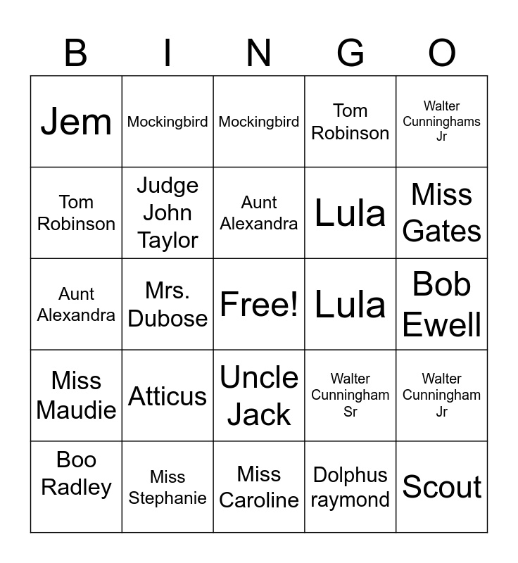 This bingo card has a free space and 29 words: Boo Radley, Heck Tate, Mrs. Dubose, Dill, Jem, Mockingbird, Judge John Taylor, Atticus, Lula, Miss Stephanie, Bob Ewell, Scout, Miss Caroline, Dolphus raymond, Miss Gates, Calpurnia, Uncle Jack, Miss Maudie, Walter Cunninghams Jr, Aunt Alexandra, Walter Cunningham Sr, Mayella Ewell, Lula, Tom Robinson, Tom Robinson, Mockingbird, Walter Cunningham Jr, Aunt Alexandra and Dill.