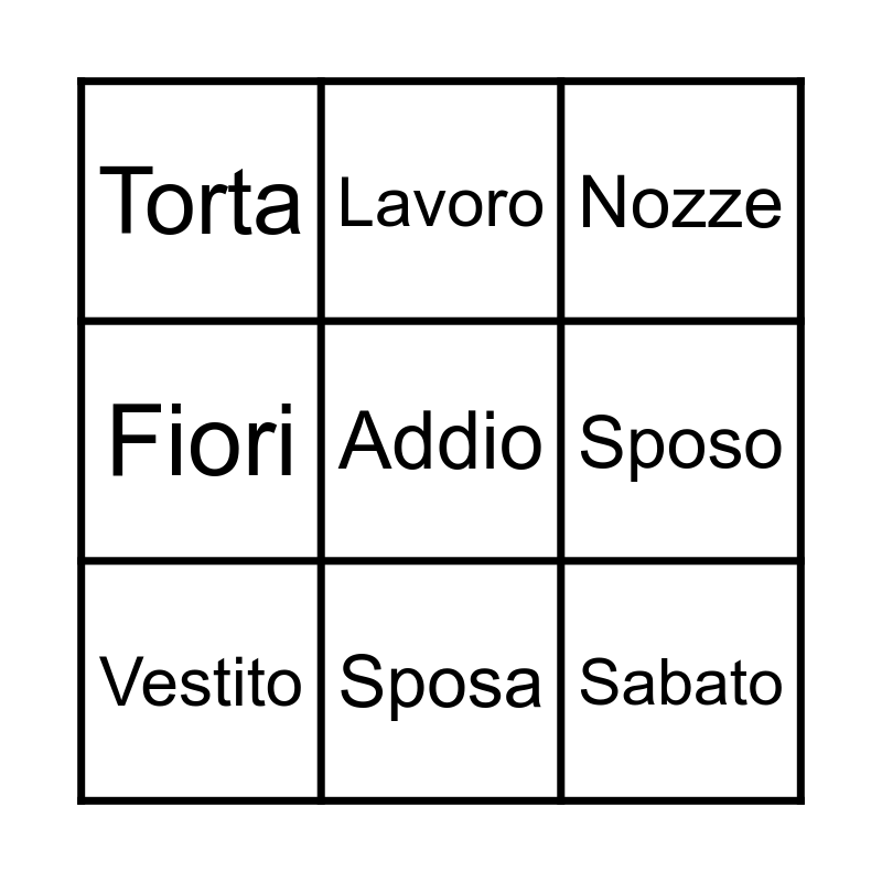 This bingo card has 27 words: Amore, Cerimonia, Sabato, Nogaredo, Sposo, Nozze, Lavoro, Futuro, Pizza, Gardaland, Anello, Fiori, Erik, Matrimonio, Abito, Bianco, Vestito, Sposa, Macchina, Torta, Trucco, Qualità, Parrucchiera, Scarpe, Tacchi, Addio and Zobele.