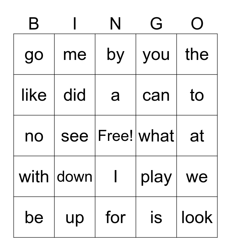 This bingo card has a free space and 24 words: down, up, a, be, the, go, like, me, what, I, can, no, play, we, did, is, at, by, to, see, look, with, you and for.