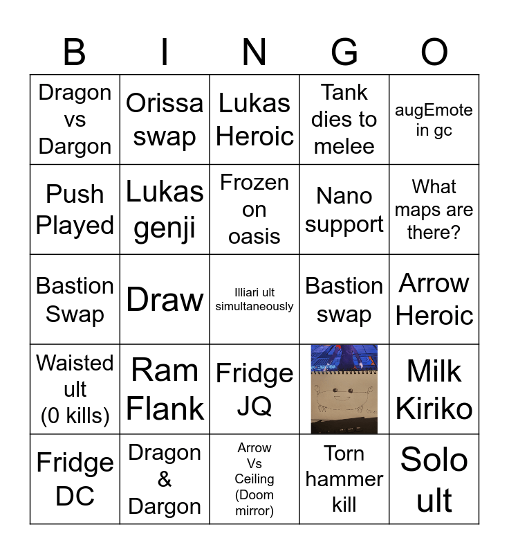 This bingo card has 1 images and 24 words: Ram Flank, Arrow Vs Ceiling (Doom mirror), Frozen on oasis, Fridge DC, augEmote in gc, Dragon vs Dargon, Push Played, Orissa swap, Bastion swap, Fridge JQ, Nano support, Bastion Swap, Milk Kiriko, Lukas genji, Solo ult, Arrow Heroic, Lukas Heroic, What maps are there?, Draw, Illiari ult simultaneously, Dragon & Dargon, Waisted ult (0 kills), Tank dies to melee and Torn hammer kill.
