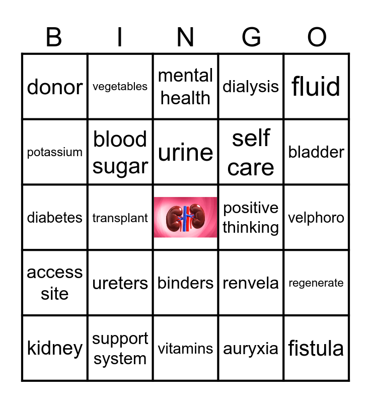 This bingo card has a free space and 39 words: low sodium, filter, active, blood sugar, kidney, binders, urine, protein, fluid, access site, transplant, dialysis, fistula, velphoro, positive thinking, ureters, body weight, donor, nutrition, renvela, potassium, vitamins, self care, bladder, UTI, doctor, pituitary gland, kidney stones, hydrated, vegetables, kidneys, liver, mental health, support system, auryxia, phosphorus, regenerate, diabetes and hypertension.