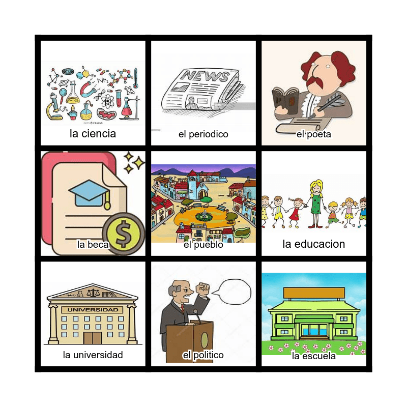 This bingo card has 11 images and 11 words: la escuela, el politico, el pueblo, la universidad, el periodico, el poeta, la educacion, el maestro, la beca, la ciencia and los libros.