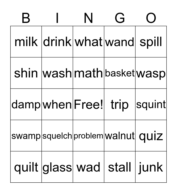 This bingo card has a free space and 24 words: squelch, glass, math, quilt, spill, milk, shin, drink, trip, problem, basket, damp, walnut, quiz, wash, stall, squint, what, wasp, when, junk, swamp, wand and wad.