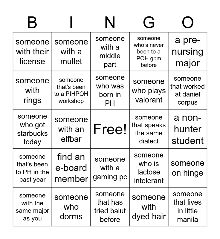 This bingo card has a free space and 24 words: find an e-board member, someone who dorms, someone who was born in PH, someone with the same major as you, a pre-nursing major, someone with their license, someone with rings, someone with a mullet, someone that speaks the same dialect, someone with a gaming pc, someone who plays valorant, someone who got starbucks today, someone who is lactose intolerant, someone on hinge, someone that's been to a PIHPOH workshop, someone with dyed hair, a non-hunter student, someone with a middle part, someone that worked at daniel corpus, someone with an elfbar, someone that lives in little manila, someone that’s been to PH in the past year, someone who’s never been to a POH gbm before and someone that has tried balut before.