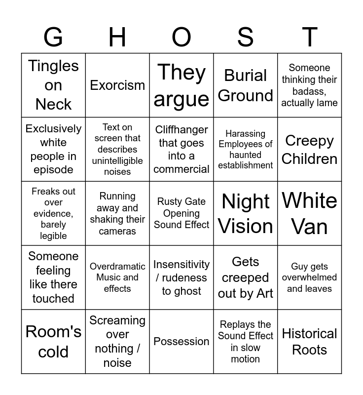 This bingo card has a free space and 58 words: Dust or Bug being Ghost Orb, Screaming over nothing / noise, Playing back video, Someone feeling like there touched, Replays the Sound Effect in slow motion, Weird and Unnecessary video effect, Text on screen that describes unintelligible noises, Being mean and blaming it on ghosts, Harassing Employees of haunted establishment, Bad luck gets blamed on curse /, Burial Ground, "Guys...What was that?" / "TURN AROUND", Predominantly Male cast, Talking to paranormal expert, Employee who has suspiciously fake ghost story, Tingles on Neck, Historical Roots, Someone thinking their badass, actually lame, Man murders family, Cliffhanger that goes into a commercial, Night Vision, They argue, Room's cold, Guy gets overwhelmed and leaves, Someones in car and touches there face in weird manner, White Van, Driving scene, Suspicious Woman, Creepy Children, Celebrity Guest / References, Abandoned Anything, Thinks theres nothing, Christian/ Catholic reference, Battery Dies at weird time, Sacrifice of some kind, Occult, Pranks, Running away and shaking their cameras, Freaks out over evidence, barely legible, Object gets thrown, Overdramatic Music and effects, Horror Movie Reference / Reference to Paranormal Activity, Gets creeped out by Art, Cultural Insensitivity, Violence against Women, Sus camera angle at host (sexual), Hosts harassing ghosts, Insensitivity / rudeness to ghost, Possession, Strange southern man, Inexplicable Injury, Host gets mad for no reason, Host acts insane / looks bewildered, Slowpan to faces, Exorcism, Paganism, Exclusively white people in episode and Random Swearing.