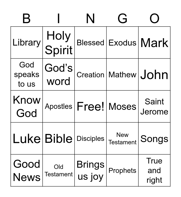 This bingo card has a free space and 24 words: Bible, Old Testament, Creation, Good News, Mark, Library, God speaks to us, Holy Spirit, Moses, Disciples, Mathew, Know God, New Testament, Songs, God’s word, Prophets, Saint Jerome, Blessed, John, Apostles, True and right, Luke, Exodus and Brings us joy.