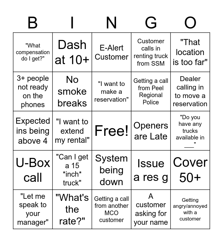 This bingo card has a free space and 24 words: "Can I get a 15 *inch* truck", "What's the rate?", "I want to make a reservation", "Let me speak to your manager", "That location is too far", "What compensation do I get?", 3+ people not ready on the phones, Dash at 10+, Openers are Late, System being down, Getting a call from Peel Regional Police, Expected ins being above 4, Issue a res g, Cover 50+, No smoke breaks, A customer asking for your name, "Do you have any trucks available in ___", E-Alert Customer, Dealer calling in to move a reservation, "I want to extend my rental", Getting angry/annoyed with a customer, U-Box call, Customer calls in renting truck from SSM and Getting a call from another MCO customer.