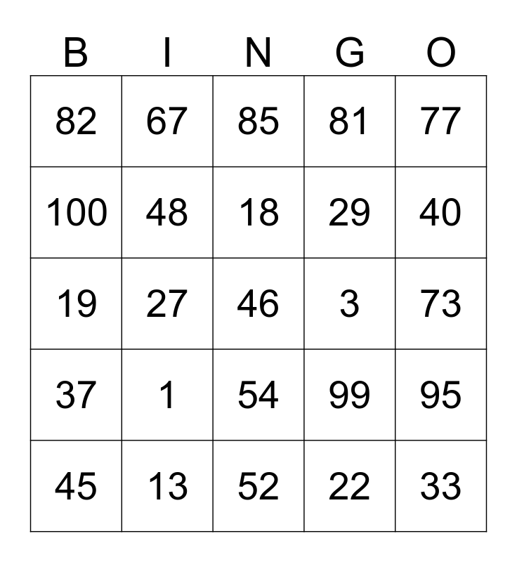 This bingo card has a free space and 24 words: 1, 13, 18, 45, 77, 82, 100, 67, 3, 54, 29, 19, 99, 95, 48, 22, 73, 85, 40, 27, 33, 37, 81 and 52.