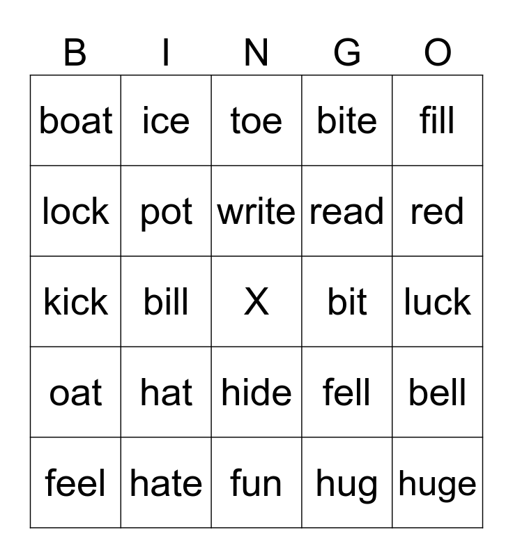 This bingo card has a free space and 24 words: feel, hat, write, hug, fill, boat, ice, toe, bit, luck, kick, pot, fell, bell, lock, hate, fun, bite, red, oat, bill, hide, read and huge.