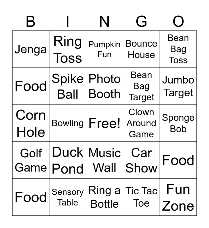 This bingo card has a free space and 24 words: Duck Pond, Sensory Table, Photo Booth, Food, Bean Bag Toss, Jenga, Food, Ring Toss, Clown Around Game, Music Wall, Bean Bag Target, Corn Hole, Car Show, Food, Spike Ball, Tic Tac Toe, Sponge Bob, Pumpkin Fun, Jumbo Target, Bowling, Fun Zone, Golf Game, Bounce House and Ring a Bottle.