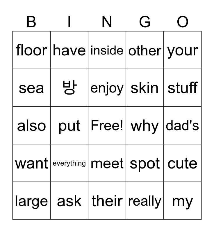 This bingo card has a free space and 29 words: large, 문, put, wall, floor, inside, 방, everything, why, ask, dad's, my, their, really, stuff, introduce, meet, want, your, also, spot, body, skin, sea, other, have, cute, enjoy and say.