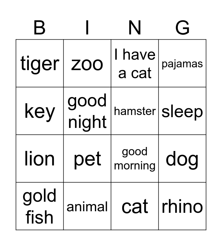 This bingo card has 17 words: gold fish, animal, I have a cat, pajamas, lion, good night, good morning, sleep, key, pet, cat, dog, tiger, zoo, hamster, rhino and wave.