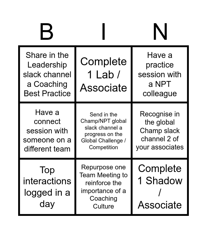 This bingo card has a free space and 24 words: Complete 3 IDPs, Ensure all your associates submitted Quarterly Goals, Repurpose one Team Meeting to reinforce the importance of a Coaching Culture, Send in the Leadership slack channel a personal shoutout to someone who coached you, Complete 1 Shadow / Associate, Share in the Leadership slack channel a Coaching Best Practice, Recognise in the global Champ slack channel 2 of your associates, Complete 1 Lab / Associate, Receive 3 signed contracts, Attend an Expedia Week learning course, Attend a meeting with another team, Receive an inbound call from a partner, Log 150 interactions, Share a best practice on #npt-global, Top interactions logged in a day, Receive a compliment from a partner or colleague, Have a shadow session with a NPT colleague, Have a practice session with a NPT colleague, Log 100 interactions, Top contracts sent in a day, Send a contract with the first call, Connect with a NPA from EMEA/LATAM, Have a connect session with someone on a different team and Receive a referral from AB/CHAMP.