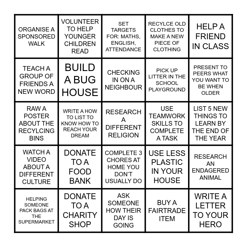 This bingo card has 25 words: DONATE TO A FOOD BANK, ASK SOMEONE HOW THEIR DAY IS GOING, CHECKING IN ON A NEIGHBOUR, HELPING SOMEONE PACK BAGS AT THE SUPERMARKET, HELP A FRIEND IN CLASS, ORGANISE A SPONSORED WALK, TEACH A GROUP OF FRIENDS A NEW WORD, VOLUNTEER TO HELP YOUNGER CHILDREN READ, USE TEAMWORK SKILLS TO COMPLETE A TASK, COMPLETE 3 CHORES AT HOME YOU DON’T USUALLY DO, PICK UP LITTER IN THE SCHOOL PLAYGROUND, RAW A POSTER ABOUT THE RECYLCING BINS, USE LESS PLASTIC IN YOUR HOUSE, RESEARCH AN ENDAGERED ANIMAL, BUILD A BUG HOUSE, WRITE A LETTER TO YOUR HERO, LIST 5 NEW THINGS TO LEARN BY THE END OF THE YEAR, SET TARGETS FOR: MATHS, ENGLISH, ATTENDANCE, PRESENT TO PEERS WHAT YOU WANT TO BE WHEN OLDER, WRITE A HOW TO LIST TO KNOW HOW TO REACH YOUR DREAM, RESEARCH A DIFFERENT RELIGION, DONATE TO A CHARITY SHOP, WATCH A VIDEO ABOUT A DIFFERENT CULTURE, RECYLCE OLD CLOTHES TO MAKE A NEW PIECE OF CLOTHING and BUY A FAIRTRADE ITEM.