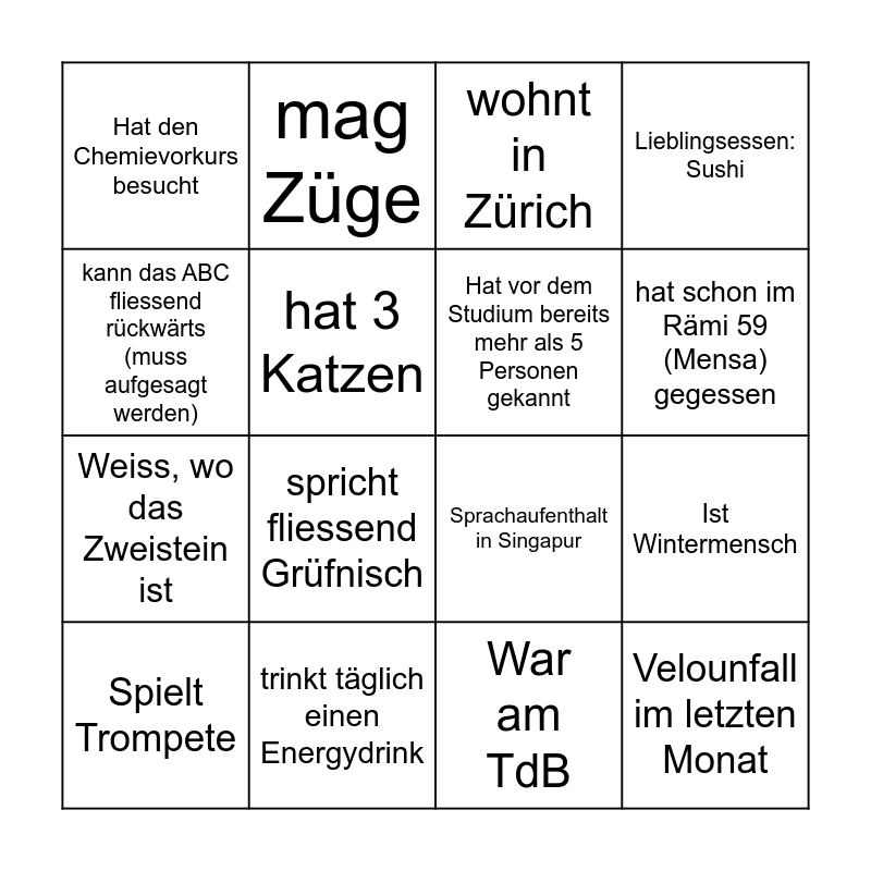 This bingo card has 16 words: trinkt täglich einen Energydrink, Ist Wintermensch, wohnt in Zürich, Hat den Chemievorkurs besucht, Weiss, wo das Zweistein ist, mag Züge, Sprachaufenthalt in Singapur, War am TdB, kann das ABC fliessend rückwärts (muss aufgesagt werden), hat 3 Katzen, Spielt Trompete, Lieblingsessen: Sushi, spricht fliessend Grüfnisch, hat schon im Rämi 59 (Mensa) gegessen, Hat vor dem Studium bereits mehr als 5 Personen gekannt and Velounfall im letzten Monat.