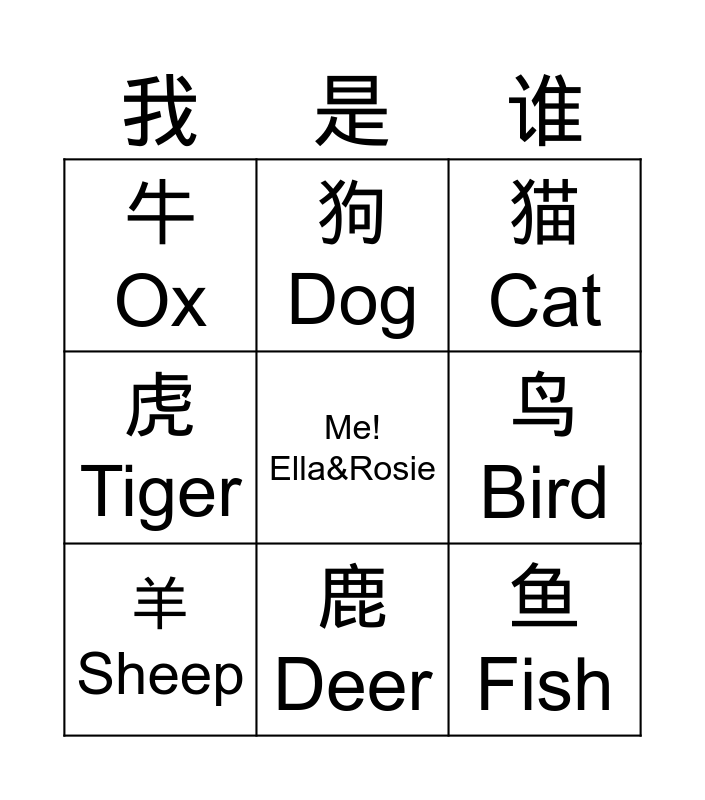 This bingo card has a free space and 8 words: 鸟 Bird, 猫 Cat, 狗 Dog, 羊 Sheep, 牛 Ox, 鱼 Fish, 虎 Tiger and 鹿 Deer.