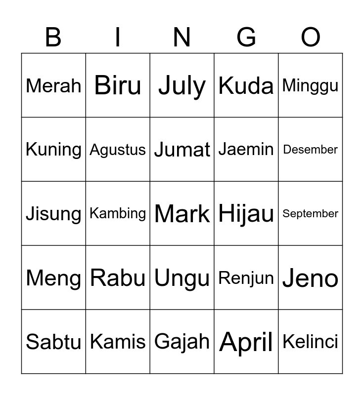 This bingo card has a free space and 24 words: Rabu, Kamis, Jumat, Sabtu, Minggu, Merah, Kuning, Biru, Hijau, Ungu, Jaemin, Jisung, Renjun, Jeno, Agustus, April, September, July, Desember, Kambing, Kelinci, Meng, Kuda and Gajah.