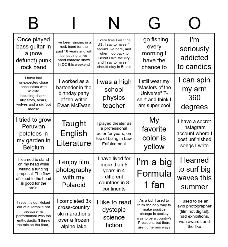 This bingo card has 42 words: Free!, I was a high school physics teacher, I love cooking Spanish and Peruvian dishes, I enjoy film photography with my Polaroid, As a kid, I used to think the only way to make positive change in society was to be a country's President, but there are numerous ways, I learned to surf big waves this summer, I played theater as a professional actor for years, on top of being in Law Enfotcement, I am fascinated by travel and I love visiting art museums and historical landmarks everywhere I go., Every time I visit the US, I say to myself I should live here, and when I go back to Beirut I like the city and I say to myself I should stay in Beirut, I have lived for more than 5 years in 4 different countries in 3 continents, I have a secret instagram account where I post unfinished songs I write, I can spin my arm 360 degrees, Taught English Literature, I'm seriously addicted to candies, I was on my way to becoming a professional actor (with many stage appearances and a movie credit), I'm a big Formula 1 fan, I play very bad chess but I love it, I tried to grow Peruvian potatoes in my garden in Belgium, I used to dance Bob Fosee´s style, I've been singing in a rock band for the past 18 years and will be leading a live band karaoke show in DC this weekend, I have had unexpected close encounters with wildlife including sharks, alligators, bears, wolves and a six foot moose, If I could only eat one thing for the rest of my life it would be plantain, I used to be an avid photographer (film not digital), had exhibitions, won awards and the like, Once played bass guitar in a (now defunct) punk rock band, My second name is Federica, I spent eleven minutes staring at the screen trying to answer this question, reflecting on my life, worrying that I’m not any fun at all, I still wear my "Masters of the Universe" T-shirt and think I am super cool, two rock songs have been written about me, I played basketball "professionally" for 8 years when I was between 8 and 16, I'm learning to play the guitar, I am a scuba diver, I learned to stand on my head while writing a funding proposal. The flow of blood to the head is good for the brain., I worked as a bartender in the birthday party of the writer Ewan McEwan, I like to read dystopic science fiction, By the time I arrive in NY for this meeting I will have gone to 5 continents this year, I recently got kicked out of a karaoke bar because my performance was too enthusiastic (I threw the mic on the floor)., I completed 3x cross-country ski marathons over a frozen alpine lake, My favorite color is yellow, I love to bake. My specialty is cheesecake, apple pie and fruitcake., I have two extra teeth in my lower jaw, which makes me (1) unable to wear braces, and (2) a mutant, I go fishing every morning I have the chance to and Maxigas is not my legal name.