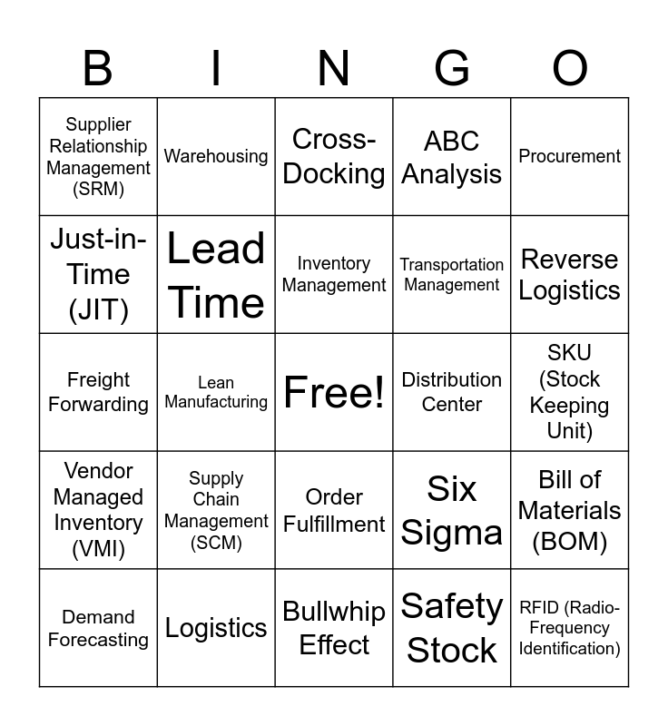 This bingo card has a free space and 24 words: Supply Chain Management (SCM), Logistics, Inventory Management, Demand Forecasting, Procurement, Supplier Relationship Management (SRM), Just-in-Time (JIT), Warehousing, Distribution Center, Order Fulfillment, Transportation Management, Freight Forwarding, Six Sigma, Bill of Materials (BOM), Lead Time, Safety Stock, SKU (Stock Keeping Unit), Cross-Docking, Reverse Logistics, Lean Manufacturing, RFID (Radio-Frequency Identification), Vendor Managed Inventory (VMI), ABC Analysis and Bullwhip Effect.