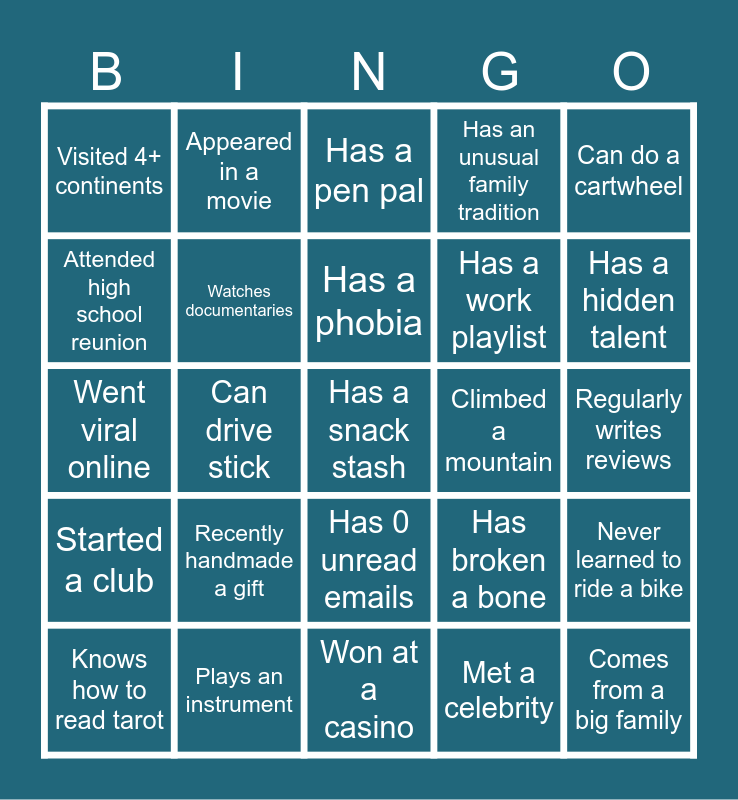 This bingo card has 30 words: Knows how to read tarot, Has been in a hot air balloon, Has a phobia, Read 10+ books this year, Can do a cartwheel, Visited 4+ continents, Appeared in a movie, Has 0 unread emails, Climbed a mountain, Comes from a big family, Started a club, Watches documentaries, Likes pineapple on pizza, Met a celebrity, Never learned to ride a bike, Played prank on a coworker, Can drive stick, Has a snack stash, Has broken a bone, Has a hidden talent, Went viral online, Plays an instrument, Has a pen pal, Has a work playlist, Regularly writes reviews, Attended high school reunion, Recently handmade a gift, Won at a casino, Has an unusual family tradition and Loves true crime podcasts.