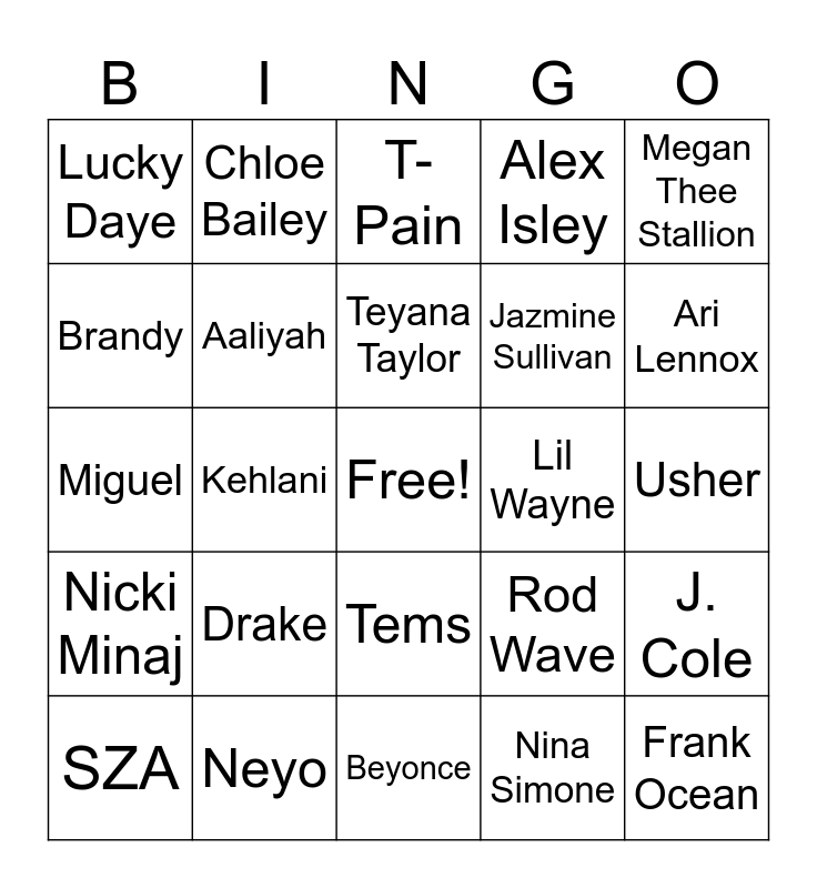 This bingo card has a free space and 29 words: SZA, Summer Walker, Kehlani, Alicia keys, Lucky Daye, T- Pain, Aaliyah, Drake, Lil Wayne, Neyo, Usher, Frank Ocean, Beyonce, Nina Simone, Ari Lennox, Lauryn Hill, Tems, Nicki Minaj, Megan Thee Stallion, Miguel, Rod Wave, Future, Jazmine Sullivan, Brandy, Alex Isley, Chloe Bailey, J. Cole, Teyana Taylor and Victoria Monet.