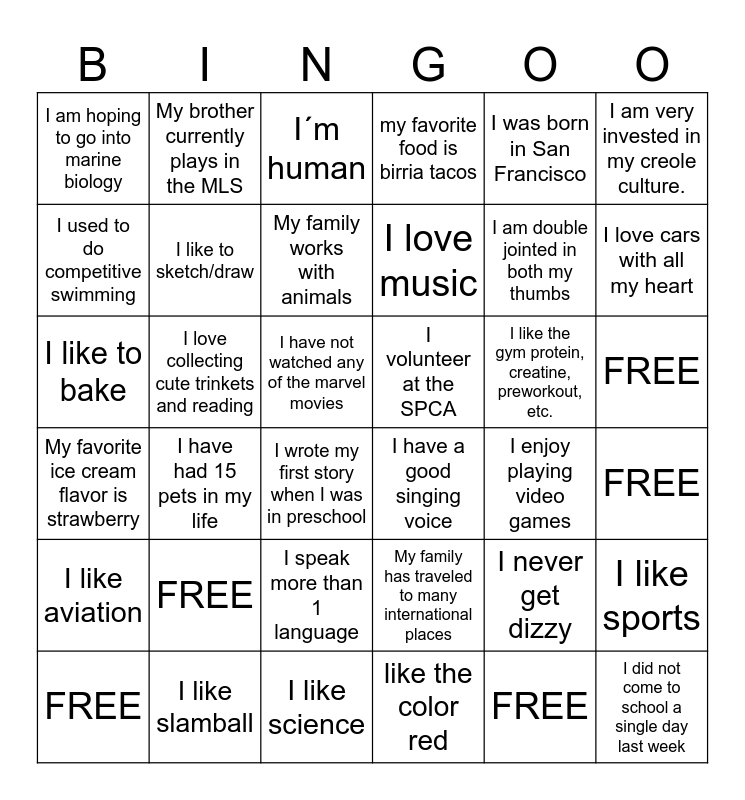 This bingo card has 36 words: My family has traveled to many international places, I speak more than 1 language, like the color red, I used to do competitive swimming, My favorite ice cream flavor is strawberry, I volunteer at the SPCA, I like to sketch/draw, I like science, I was born in San Francisco, I never get dizzy, I love cars with all my heart, my favorite food is birria tacos, I like sports, I love collecting cute trinkets and reading, I love music, I am hoping to go into marine biology, I like aviation, I like the gym protein, creatine, preworkout, etc., I like to bake, I´m human, I have not watched any of the marvel movies, I have had 15 pets in my life, I have a good singing voice, I wrote my first story when I was in preschool, I enjoy playing video games, My brother currently plays in the MLS, I am double jointed in both my thumbs, I like slamball, My family works with animals, I am very invested in my creole culture., I did not come to school a single day last week, FREE, FREE, FREE, FREE and FREE.