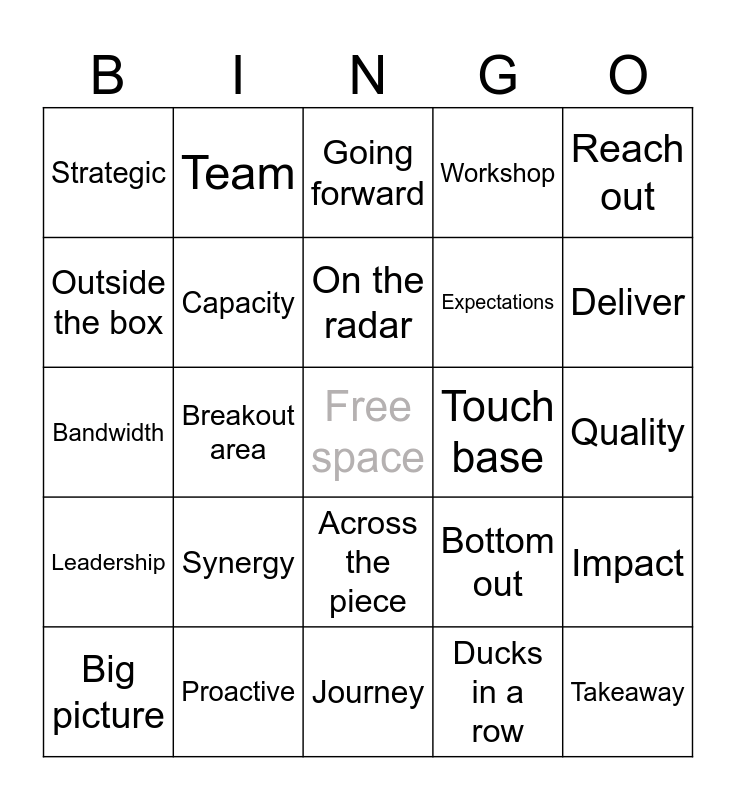 This bingo card has a free space and 24 words: Synergy, Proactive, On the radar, Big picture, Reach out, Strategic, Outside the box, Team, Touch base, Across the piece, Expectations, Bandwidth, Bottom out, Impact, Capacity, Ducks in a row, Quality, Going forward, Deliver, Breakout area, Takeaway, Leadership, Workshop and Journey.