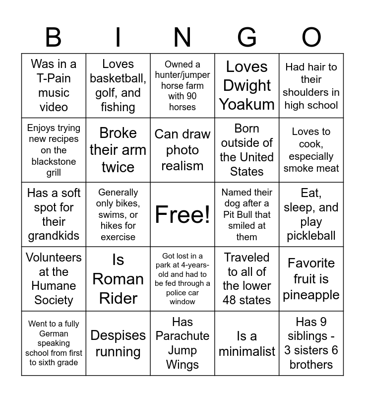 This bingo card has a free space and 52 words: Has 3 little girls all under the age of 4, Has 9 siblings - 3 sisters 6 brothers, Was an art major for 2 years and specialized in candle carving, Has Parachute Jump Wings, Is Roman Rider, Spent 10 days playing 14 rounds of golf in the rain and loved it, Loves basketball, golf, and fishing, Enjoys the outdoors (hunting, archery, camping, skiing, golf), Enjoys trying new recipes on the blackstone grill, Has dislocated their right knee five times, Broke their arm twice, Danced for 10 years, Favorite fruit is pineapple, Traveled to all of the lower 48 states, Huge fan of Formula One racing, Collects classic cars, Can draw photo realism, Named their dog after a Pit Bull that smiled at them, Collects teak wood, Had hair to their shoulders in high school, Generally only bikes, swims, or hikes for exercise, Is a minimalist, Was in a T-Pain music video, Born outside of the United States, Caught a trout with their bare hands, Completed two 5ks without walking or running them, Played golf at two courses that have hosted the U.S. Open, Has catered for 100+ people, Loves to cook, especially smoke meat, A big international soccer fan and both kids play soccer, Played and coached baseball for 17 years after college, Loves Dwight Yoakum, First concert was Dolly Parton and Kenny Rogers, Has a Masters in Exercise Sports Management, Loves liver and onions, Owned a hunter/jumper horse farm with 90 horses, Despises running, New grandfather, Expert in frozen pizza, Enjoys golf and wine, separately, Went on their first mission trip to the Dominican Republic, Eat, sleep, and play pickleball, Volunteers at the Humane Society, Offered a recording contract at 6-years-old, Got lost in a park at 4-years-old and had to be fed through a police car window, Loves golf even though they almost got their eye taken out by a golf ball, Really like Yorkies and Dachshunds, Has a soft spot for their grandkids, Has a skill set to rebuild old muscle cars, Lived on a strawberry farm when they were a kid and had a horse named Carmelo, Went to a fully German speaking school from first to sixth grade and Started fishing at 12-years-old but has never harvested a fish.