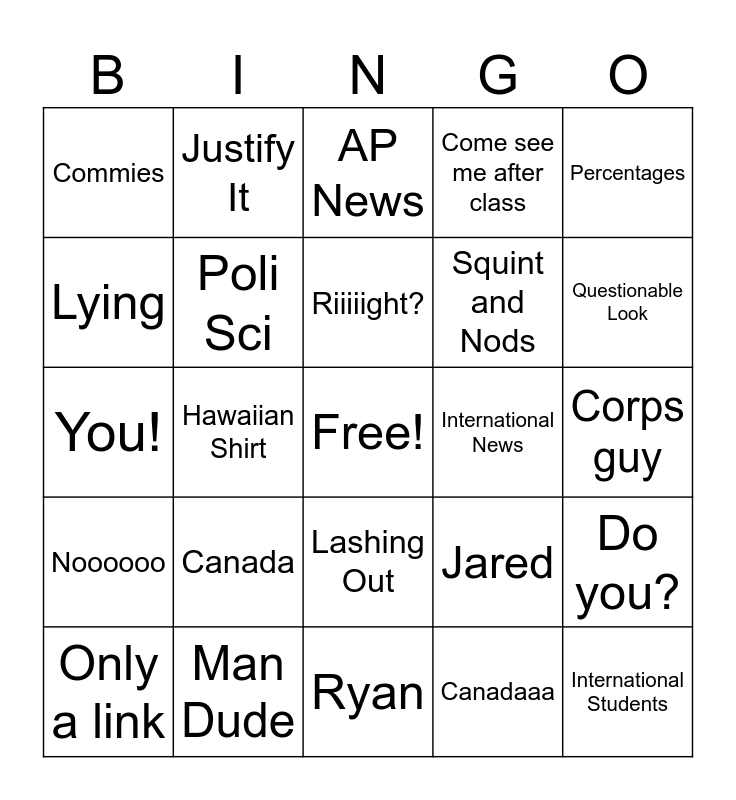 This bingo card has a free space and 25 words: Canada, Ryan, Riiiiight?, Only a link, Percentages, Commies, Lying, Justify It, International News, Lashing Out, Squint and Nods, You!, Jared, Do you?, Poli Sci, Speaking Spanish, Corps guy, AP News, Questionable Look, Hawaiian Shirt, International Students, Man Dude, Noooooo, Come see me after class and Canadaaa.