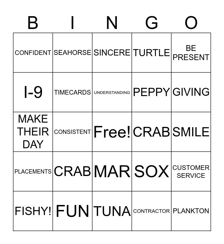 This bingo card has a free space and 71 words: STARFISH, SEAHORSE, SHARK, WHALE, TUNA, LOBSTER, TURTLE, SHRIMP, PEPPY, FEARLESS, FISHY!, PHILANTHROPY, GIVING, CONFIDENT, PLAY, MAKE THEIR DAY, SOX, BE PRESENT, CHOOSE YOUR ATTITUDE, SMILE, CRAB, PLANKTON, CUSTOMER SERVICE, GENUINE, COMPLIANCE, GMC, BRV, PAYROLL, PIKE PLACE, FOSI, FUN, OCTOPUS, DOLPHIN, JUST KEEP SWIMMING, CONTRACTOR, TALENTWISE, FAO, WOTC, I-9, ACCOUNTING, MAR, UNBILLED, PLACEMENTS, HELPING HANDS, APEX, LAB SUPPORT, VMS, TIMECARDS, SPREAD, TEAM, HELPFUL, KIND, CRAB, MARLIN, DETAIL-ORIENTED, HARDWORKING, UNDERSTANDING, DEDICATED, EFFICIENT, MOTIVATED, INNOVATIVE, RELIABLE, CONSISTENT, POLITE, ORGANIZED, SUPPORTIVE, SINCERE, RESPECTFUL, PLANKTON, CHANGE REQUESTS and HRSMART.