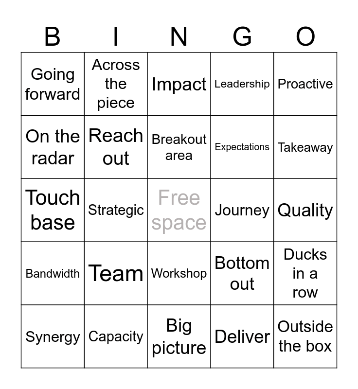 This bingo card has a free space and 24 words: Team, Capacity, Breakout area, Synergy, Proactive, Going forward, On the radar, Across the piece, Journey, Workshop, Expectations, Touch base, Bottom out, Ducks in a row, Reach out, Deliver, Quality, Impact, Takeaway, Strategic, Outside the box, Bandwidth, Leadership and Big picture.