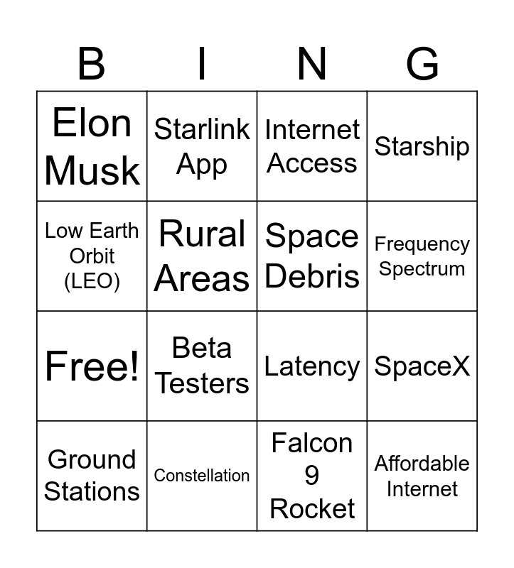 This bingo card has 20 words: SpaceX, Satellite, Internet Access, Global Coverage, Ground Stations, Low Earth Orbit (LEO), Constellation, Elon Musk, Free!, Starlink App, Beta Testers, Latency, Rural Areas, Affordable Internet, Space Debris, Satellite Internet Speed, Frequency Spectrum, Starship, Falcon 9 Rocket and Digital Divide.