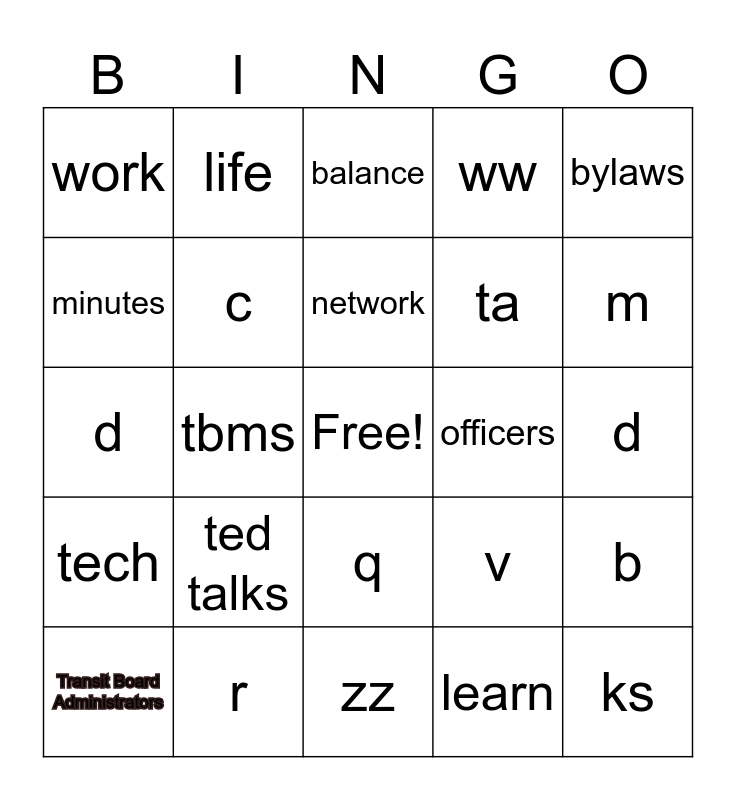 This bingo card has a free space and 24 words: Transit Board Administrators, ted talks, network, learn, bylaws, work, life, balance, officers, d, d, c, v, b, minutes, r, zz, ww, m, tech, tbms, q, ta and ks.