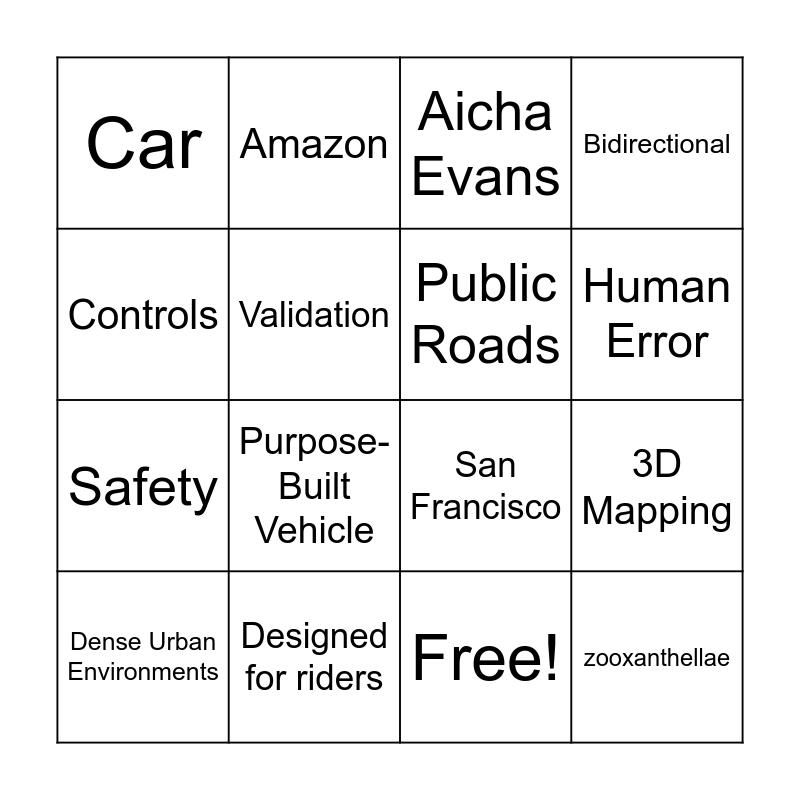 This bingo card has 17 words: Free!, Dense Urban Environments, Aicha Evans, Car, Purpose-Built Vehicle, Bidirectional, 3D Mapping, Public Roads, Human Error, Validation, Designed for riders, San Francisco, Controls, Amazon, Safety, Internships@zoox.com and zooxanthellae.