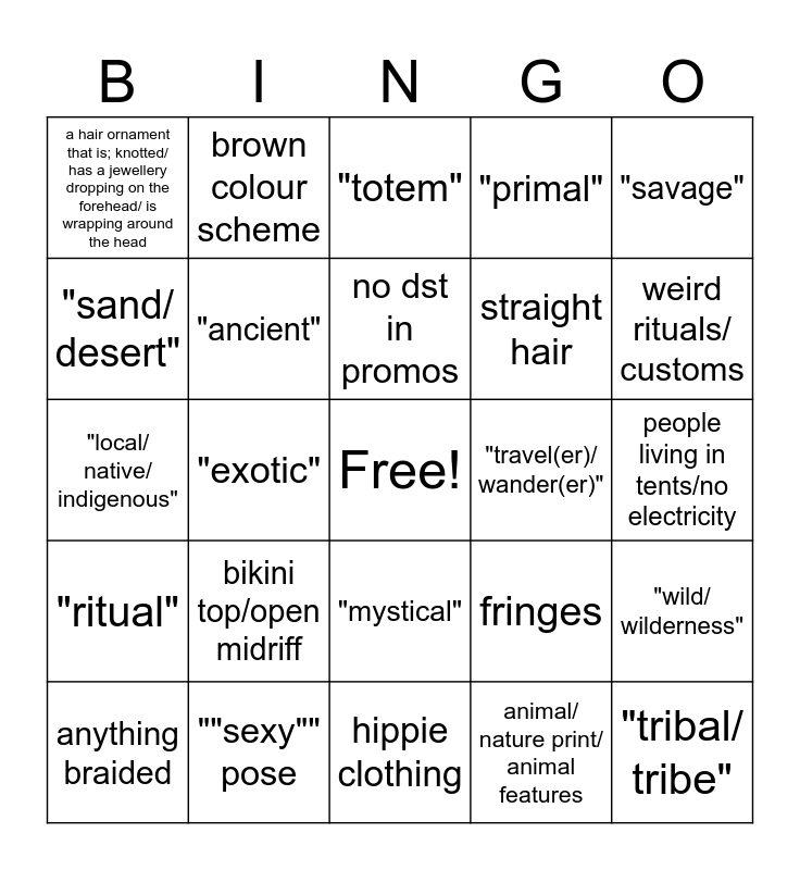This bingo card has a free space and 24 words: bikini top/open midriff, ""sexy"" pose, no dst in promos, anything braided, "savage", a hair ornament that is; knotted/ has a jewellery dropping on the forehead/ is wrapping around the head, "sand/ desert", brown colour scheme, "travel(er)/ wander(er)", "mystical", straight hair, "local/ native/ indigenous", fringes, "wild/ wilderness", "ancient", animal/ nature print/ animal features, people living in tents/no electricity, "totem", weird rituals/ customs, "exotic", "tribal/ tribe", "ritual", "primal" and hippie clothing.