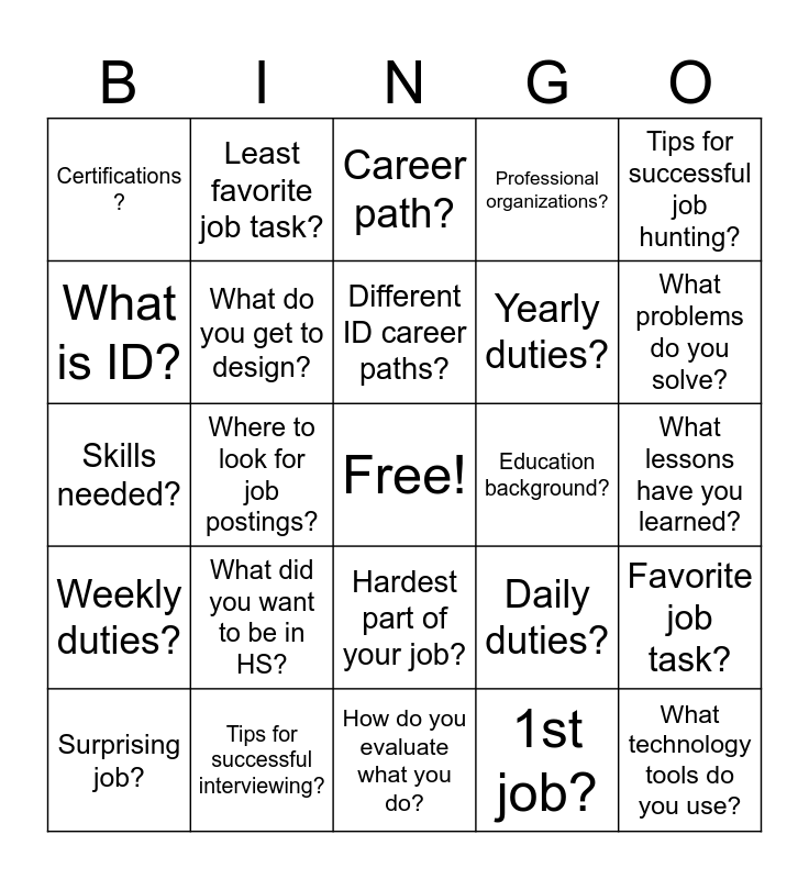 This bingo card has a free space and 24 words: Surprising job?, What did you want to be in HS?, Different ID career paths?, 1st job?, Tips for successful job hunting?, Certifications ?, Least favorite job task?, Career path?, Education background?, What lessons have you learned?, Skills needed?, What do you get to design?, Daily duties?, Favorite job task?, What is ID?, Tips for successful interviewing?, How do you evaluate what you do?, Professional organizations?, What problems do you solve?, Weekly duties?, Where to look for job postings?, Hardest part of your job?, Yearly duties? and What technology tools do you use?.