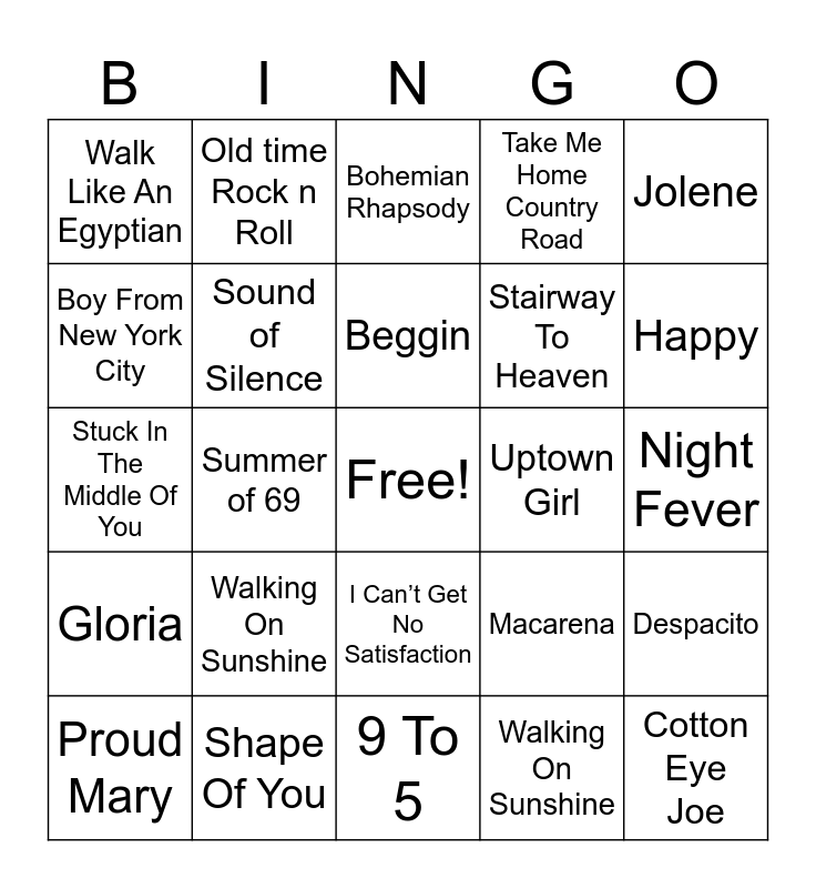 This bingo card has a free space and 35 words: Rolling in the Deep, Sweet Caroline, Flowers, Sound of Silence, I Can’t Get No Satisfaction, Take Me Home Country Road, Boy From New York City, Rasputin, Beggin, Puttin' On the Ritz, Stuck In The Middle Of You, Jolene, Sweet Dreams Are Made of These, Never Gonna Give You Up, Walk Like An Egyptian, Uptown Girl, Walking On Sunshine, Summer of 69, Gloria, Cotton Eye Joe, Macarena, Proud Mary, Despacito, Shape Of You, Bohemian Rhapsody, Happy, Billie Jean, Imagine, Stairway To Heaven, Night Fever, We Didn’t Start The Fire, 9 To 5, Walking On Sunshine, Old time Rock n Roll and Grease.