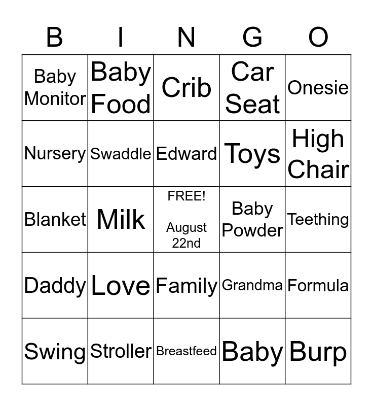 This bingo card has a free space and 32 words: Baby, Baby Lotion, Milk, Mommy, Daddy, Swaddle, Onesie, Formula, Baby Food, May, Edward, Crib, Booties, Diaper, Baby Powder, Pacifier, Swing, Blanket, Family, Love, Grandma, Grandpa, Teething, Stroller, Burp, Car Seat, Toys, Nursery, Baby Monitor, Breastfeed, Nap Time and High Chair.