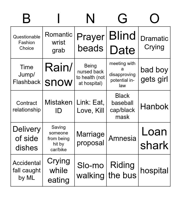 This bingo card has a free space and 84 words: childhood/previous life connections, Betrayal, Prayer beads, Someone threatens to hit someone else, Car accident, product placement, gay, music tells you how to feel, Mouth sounds/talking with mouth full, Random english speaking, Bullying/ Abuse, Slap, Rain/ snow, Black baseball cap/black mask, Enemies to lovers, Questionable Fashion Choice, Accidental fall caught by ML, Time Jump/ Flashback, You're not my type, Trapped in elevator/room, Drunken Piggyback, meeting with a disapproving potential in-law, hospital, Throwing up, Mistaken ID, Faked Death, Coffee Shop, Drink in the face, Cross dressing, Drinking alcohol, Saving someone from being hit by car/bike, Hiding, Blowing on wound, Contract relationship, Back hug, Totally or partially orphaned, Slo-mo walking, wide eye kiss, bad boy gets girl, Delivery of side dishes, Love Triangle, Drunk Confession, Guy is CEO/Heir of Company (Chaebol), Almost Drowning, Evil Mother, Traveling Abroad, Romantic wrist grab, Someone gets called a pervert, Hitting with bag/purse, attending sauna together, Fake relationship, Amnesia, Blind Date, Accident prone main female lead, Shower scene, Return of the Ex, Crying while eating, Being nursed back to health (not at hospital), Fighting!, Hanbok, Airport scene, Fisticuffs, Ignoring call/text, too emotional to walk straight, Almost getting hit by vehicle, Broken/lost phone, Childhood trauma, Lapse in logic, Dramatic Crying, Bathroom emergency, Loan shark, Inner monologue, Noble Idiocy, Perfect second Lead, Marriage proposal, Riding the bus, Multiple part time jobs, Fainting, 6 Pack/Chocolate Abs, Childhood Sweet heart, Jerk with a sweet side, Stopping in the middle of crossing street, Candy Character and Rooftop.