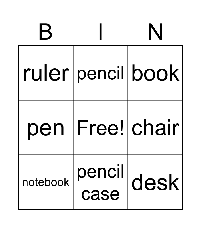 This bingo card has a free space and 9 words: notebook, book, pencil, pen, ruler, chair, desk, eraser and pencil case.