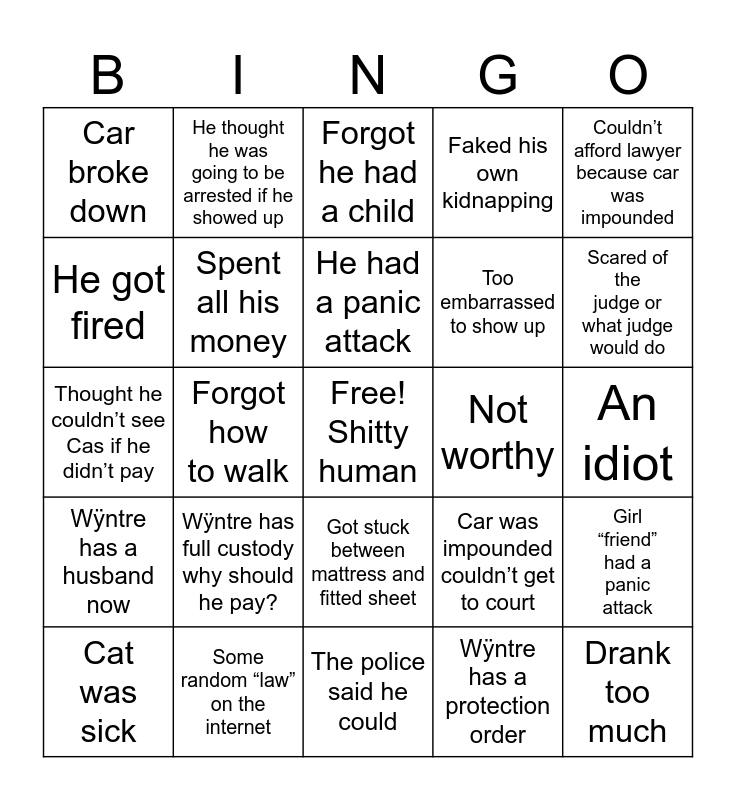 This bingo card has a free space and 29 words: Cat was sick, He doesn’t have a lawyer, Forgot how to walk, Forgot what day it is, Car broke down, Forgot he had a child, Spent all his money, Wÿntre has full custody why should he pay?, Not worthy, Some random “law” on the internet, An idiot, Drank too much, The police said he could, Wÿntre has a protection order, Scared of the judge or what judge would do, Adhd time blindness, Got stuck between mattress and fitted sheet, Wÿntre has a husband now, Couldn’t afford lawyer because car was impounded, Thought he couldn’t see Cas if he didn’t pay, Car was impounded couldn’t get to court, Granted continuance on another case, Too embarrassed to show up, He got fired, Faked his own kidnapping, He thought he was going to be arrested if he showed up, Girl “friend” had a panic attack, He had a panic attack and Cat law: stuck under a laying cat.