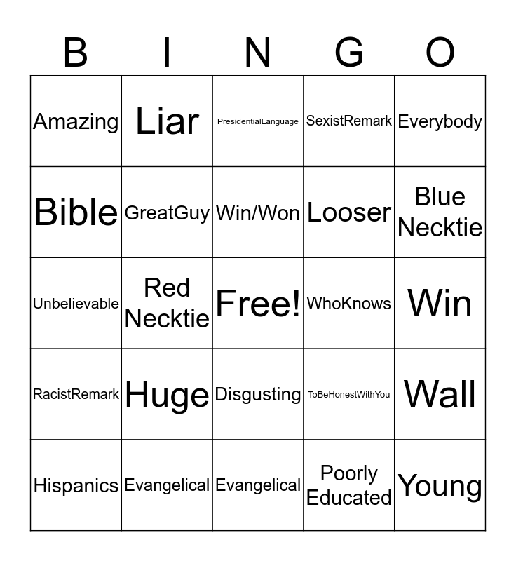 This bingo card has a free space and 24 words: Huge, Evangelical, Win/Won, Hispanics, Everybody, Amazing, Bible, Liar, WhoKnows, Disgusting, Looser, Unbelievable, ToBeHonestWithYou, Wall, GreatGuy, Poorly Educated, Win, PresidentialLanguage, Blue Necktie, Red Necktie, Young, RacistRemark, SexistRemark and Evangelical.